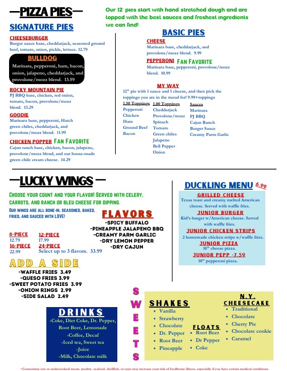 The menu also thoughtfully includes a "Duckling" section with kid-friendly favorites—smaller portions of burgers, grilled cheese, and junior pepperoni pizza—making it easy for families to find something comforting and familiar. End your meal on a simple sweet note with freshly baked cookies that complement the overall homey feel of the dining experience.