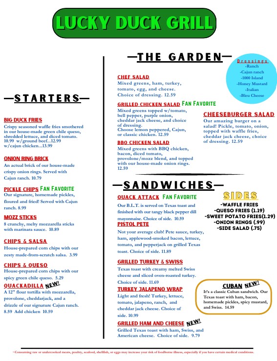 At Lucky Duck Grill, the menu offers a welcoming blend of casual, comforting fare that feels just right for any time of day. Whether you're stopping by for a relaxed lunch or a satisfying dinner, you'll find a variety of hearty options from fresh salads to flavorful burgers and classic sides.